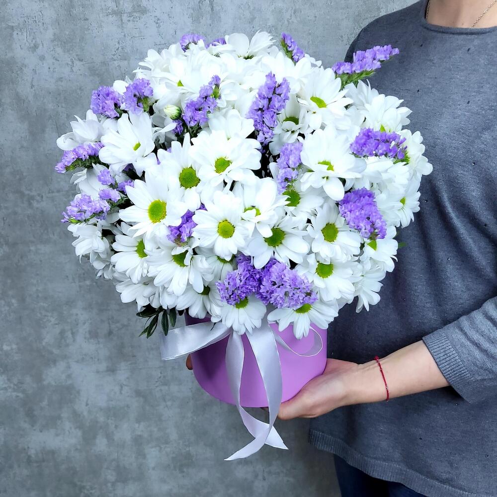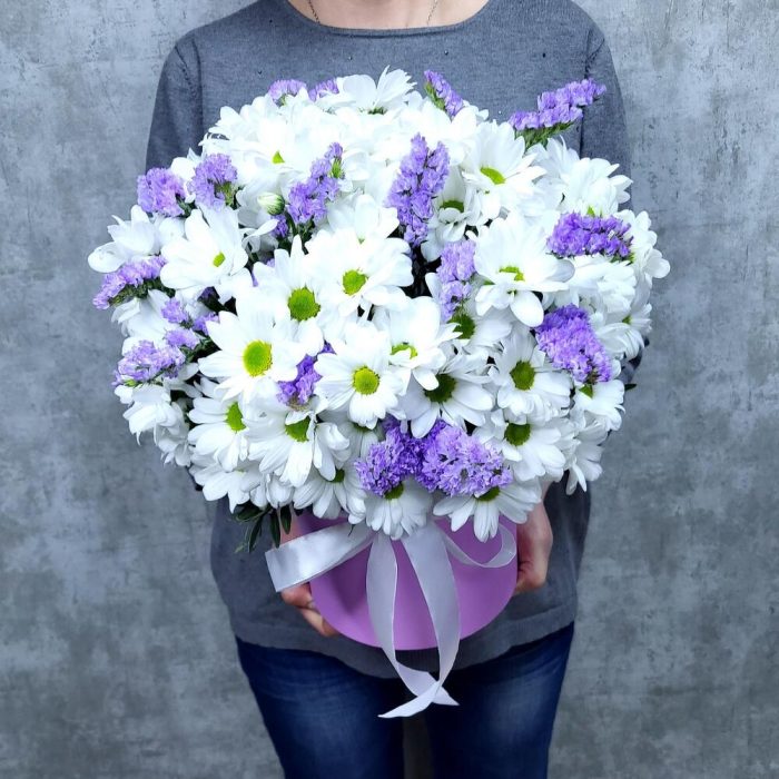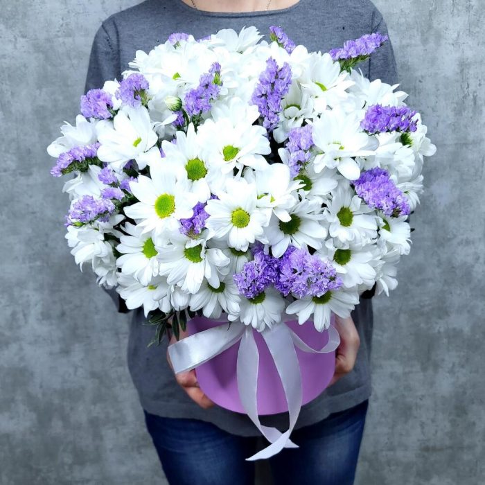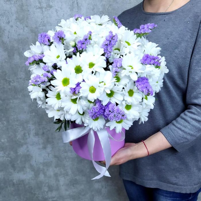 “Сиреневый туман” – композиция из гипсофилы в шляпной коробке