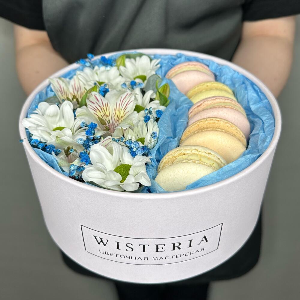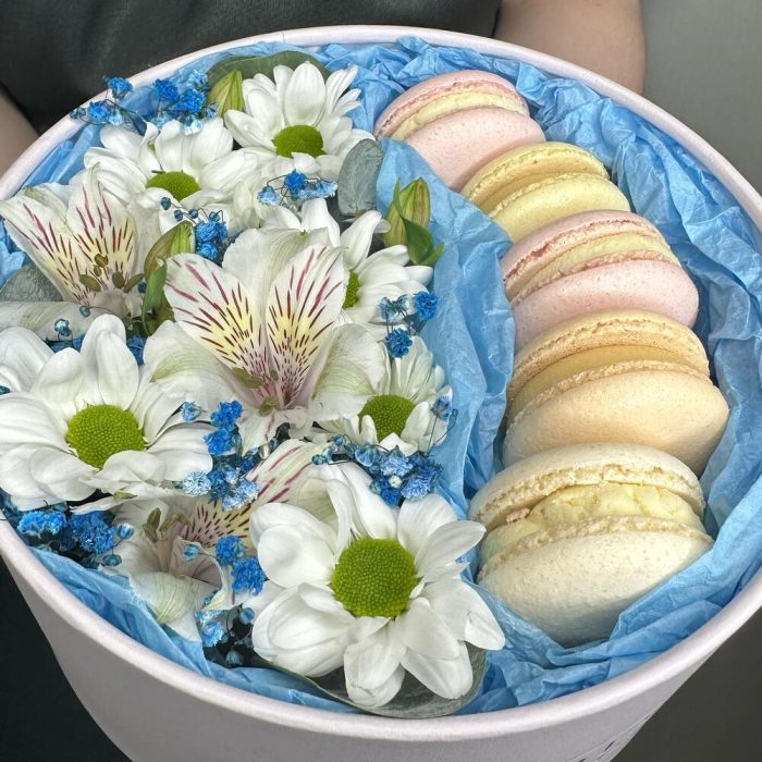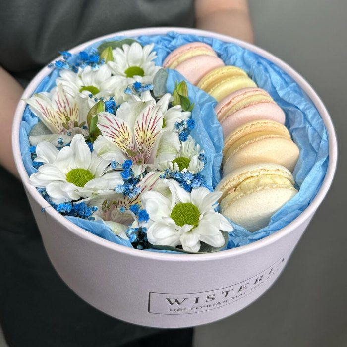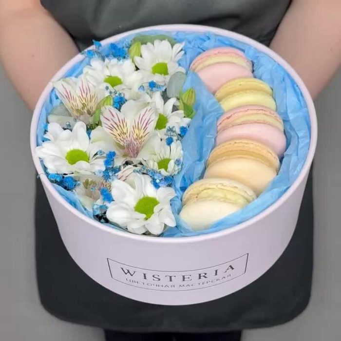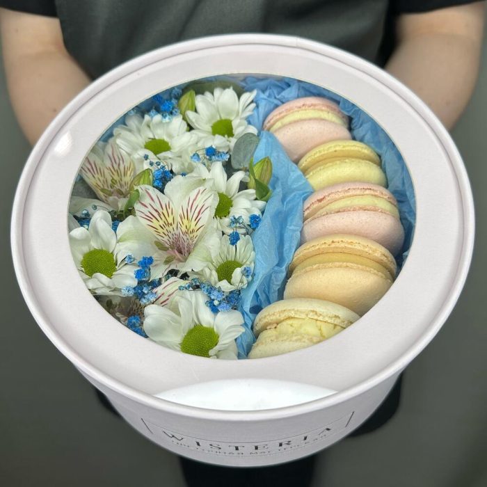 Живые цветы и макаруны в круглой коробке