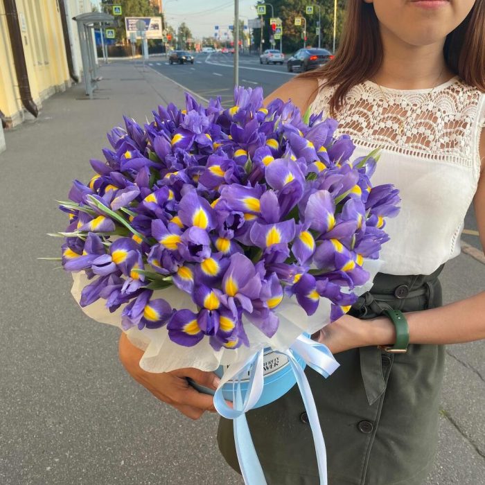 Букет из 51 ириса в дизайнерской коробке “Блэквуд”