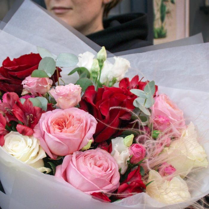 Французская роза – 2 шт.Пионовидная роза – 3 шт.белая роза – 3 шт.Эустома – 1 шт.Альстромерия – 3 шт.Роза кустовая – 2 шт.Ковыль – 2 шт.Эвкалипт – 2 шт.Тишью – 2 шт.Матовая пленка – 2 шт.Лента атласная – 2 шт.