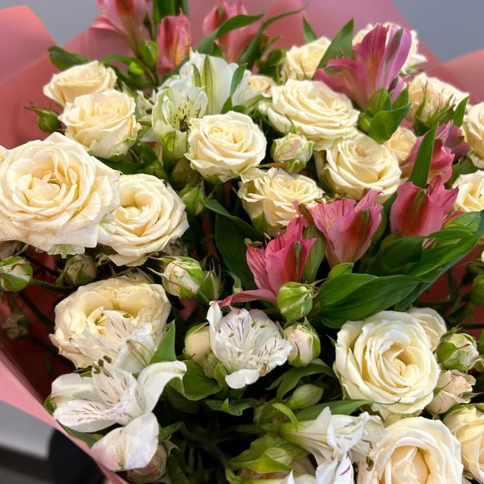 Букет из кремовых кустовых роз и альстромерии