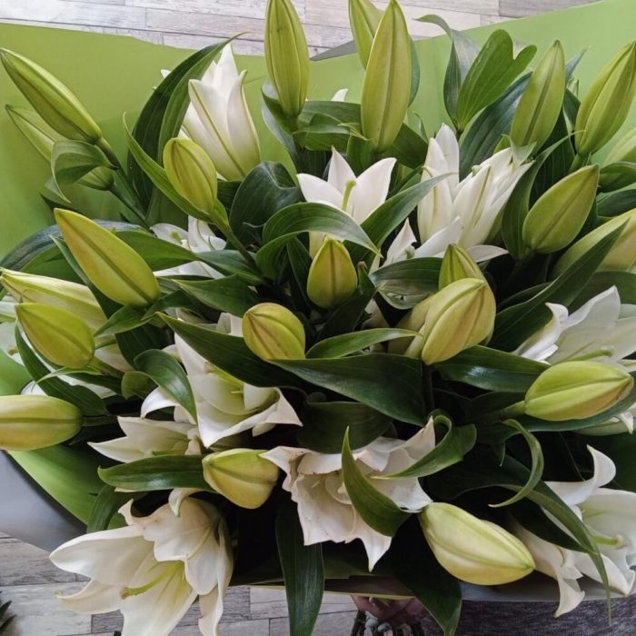 Лента атласная – 3 шт.Упаковка дизайнерская – 4 шт.Лилия ориентальная – 9 шт.