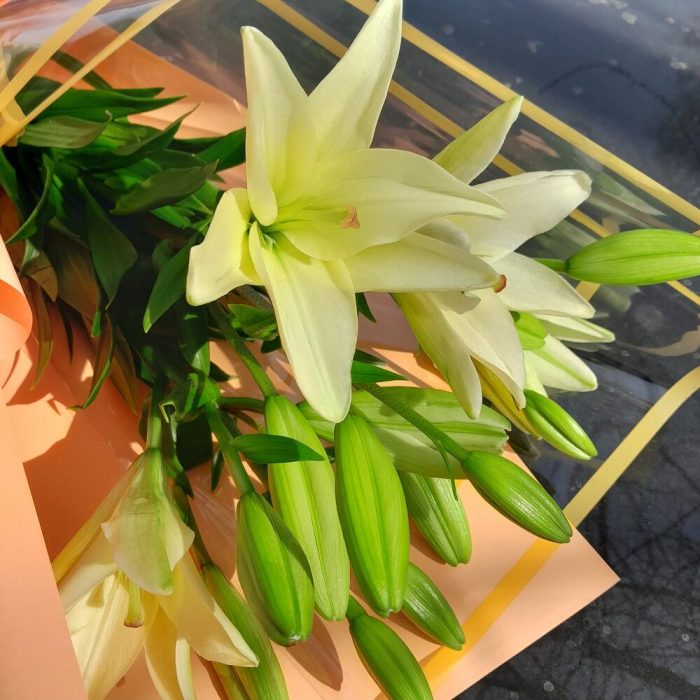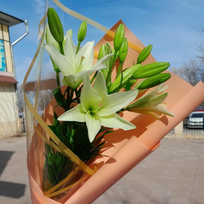 Лилия Азиатская белая – 3 шт.Упаковка дизайнерская – 3 шт.Лента атласная – 2 шт.