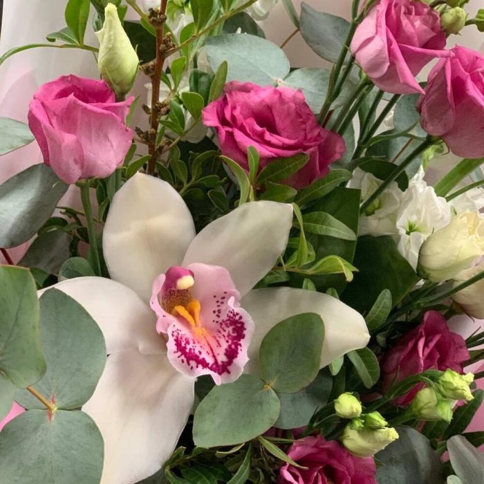 Орхидея Цимбидиум – 1 шт.Маттиола – 2 шт.Лизиантус – 2 шт.Фисташка – 3 шт.Эвкалипт – 2 шт.Упаковка дизайнерская – 1 шт.