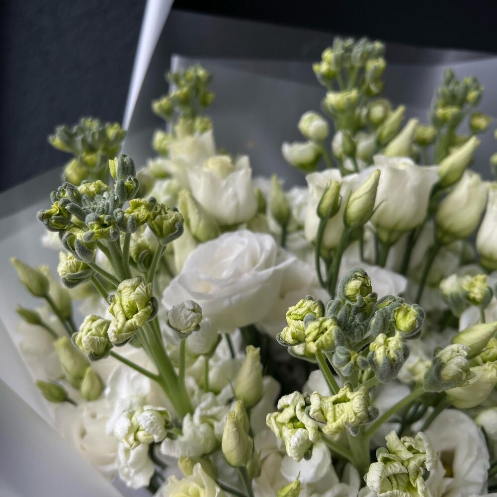 Маттиола – 10 шт.Лизиантус – 9 шт.декоративная упаковка – 1 шт.Атласная лента – 1 шт.