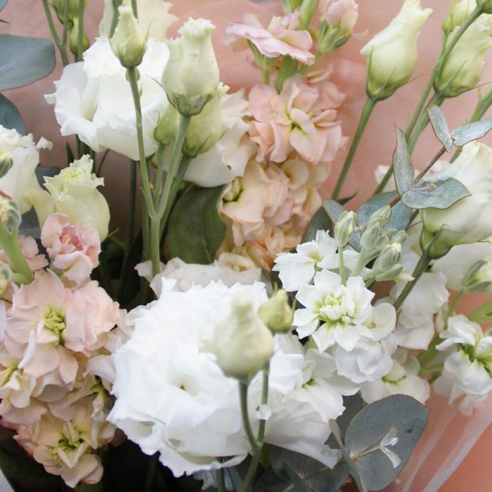 Букет из маттиолы и эустомы с добавлением ароматного эвкалипта