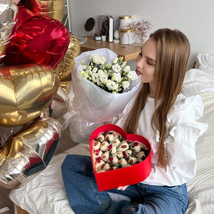 эустома белая – 5 шт.сердце фольгированное – 20 шт.клубника в бельгийском шоколаде – 22 шт.бокс сердце – 1 шт.
