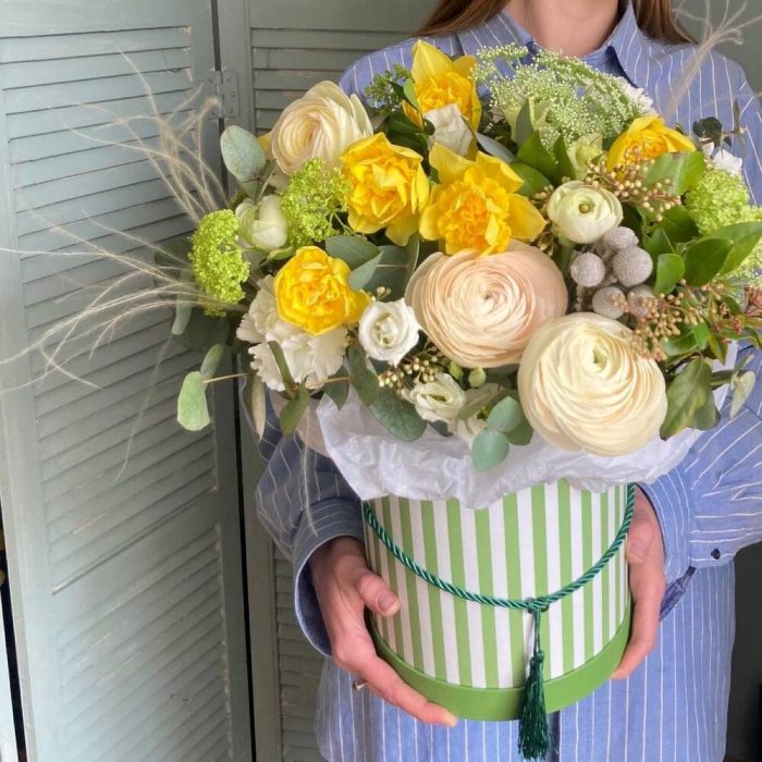 Композиция в шляпной коробке с ранункулюсами и нарциссами