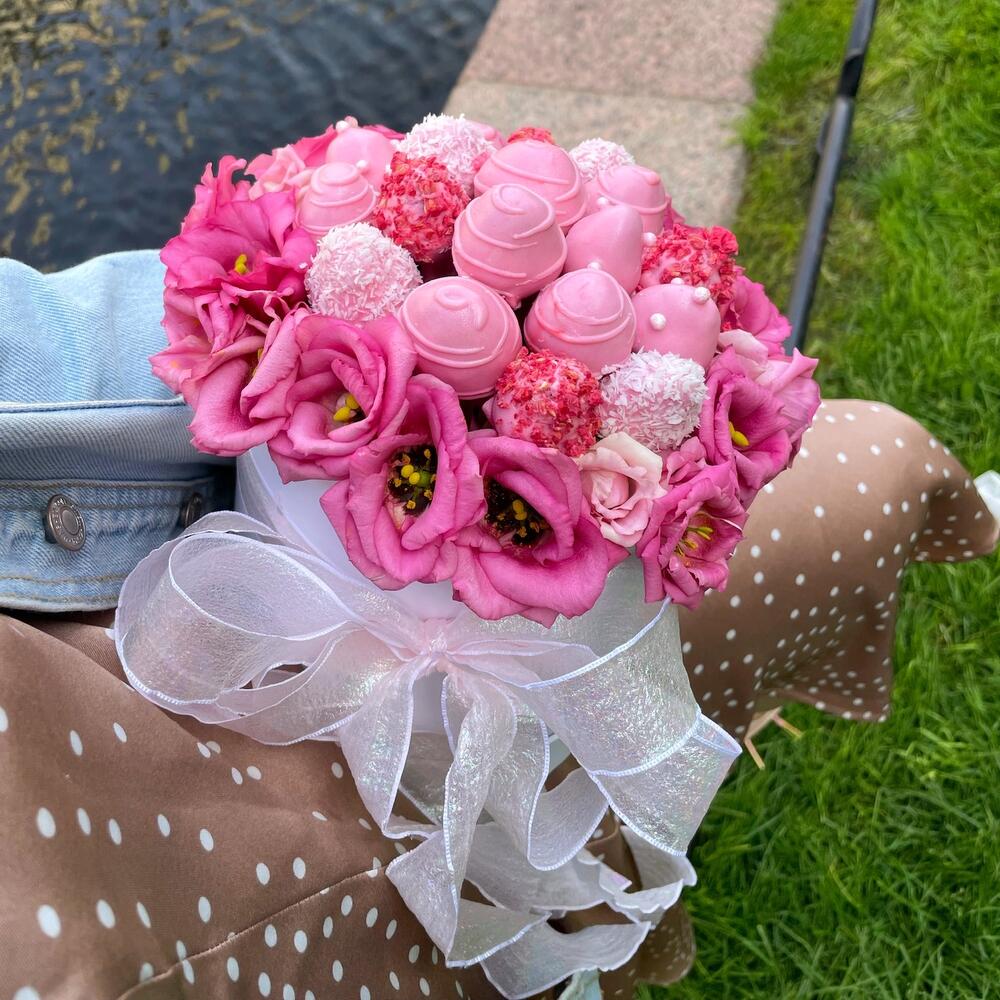 эустома розовая – 5 шт.клубника в бельгийском шоколаде – 300 гр.
