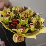 Авторский букет с зеленой орхидеей и хиперикумом