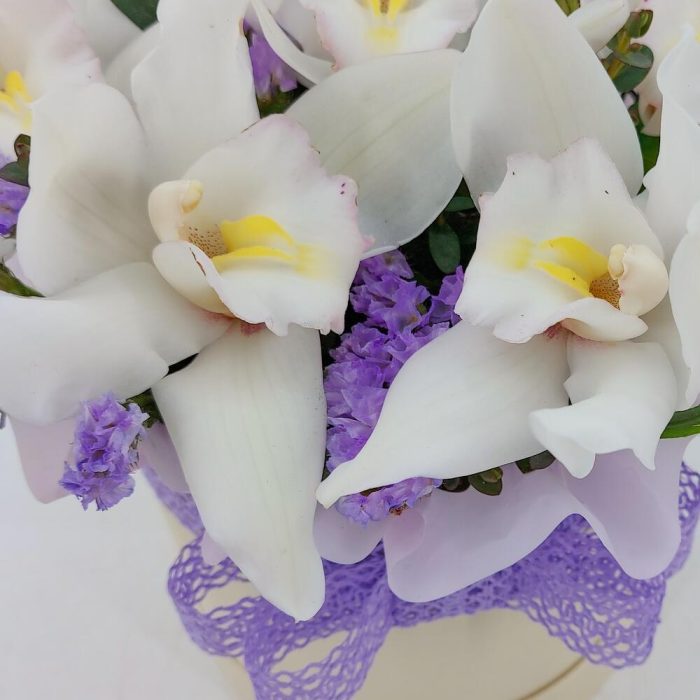 Белые орхидеи в коробке Ваниль и лаванда
