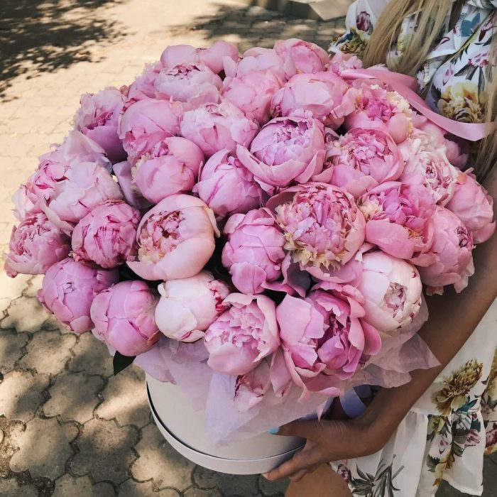 Лента атласная – 3 шт.Пион Сара Бернар – 51 шт.Оазис флористический – 3 шт.коробка шляпная xl – 1 шт.