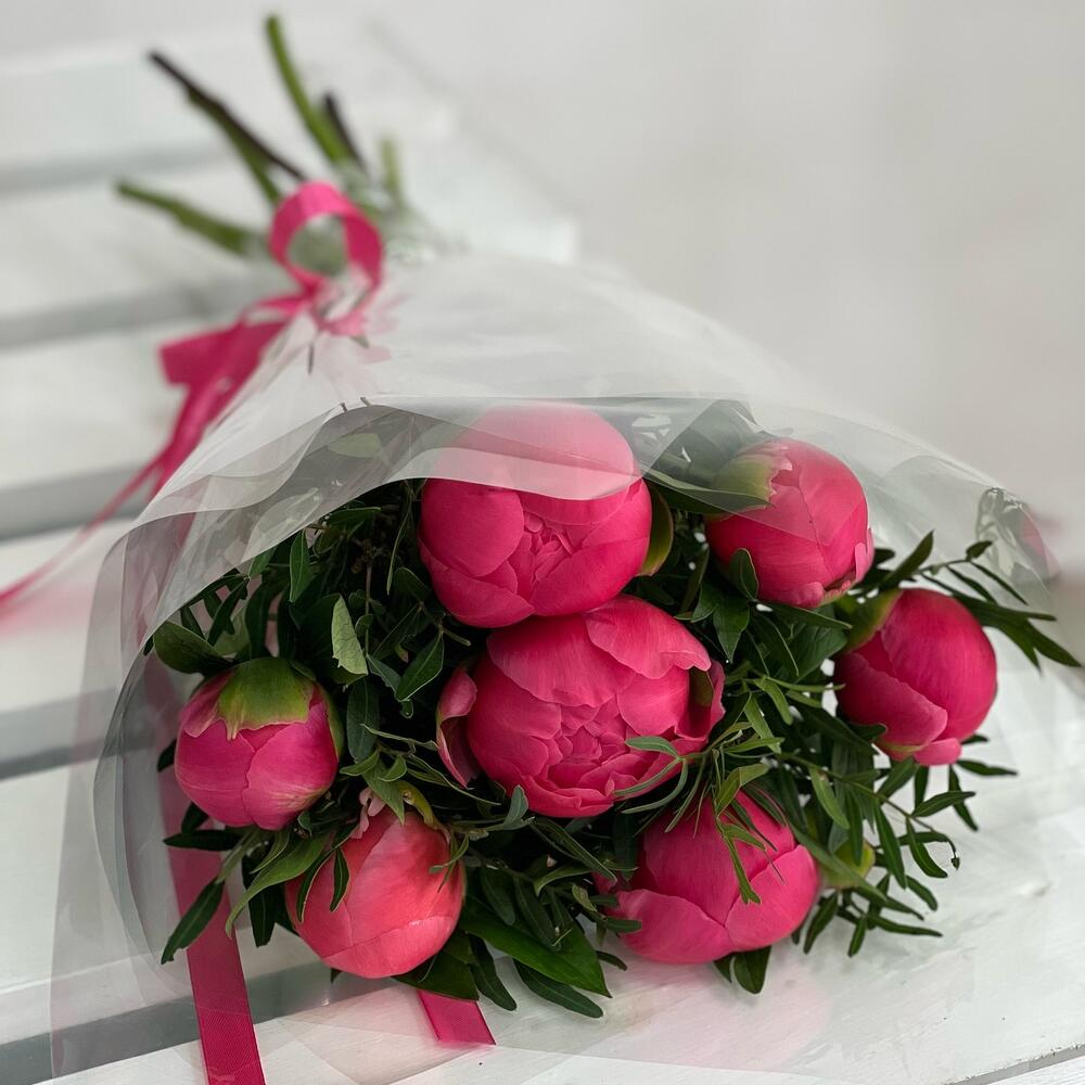 Пион Коралл Шарм (Coral Charm) – 7 шт.Лента атласная – 1 шт.Пленка прозрачная – 1 шт.фисташка зелень – 3 шт.