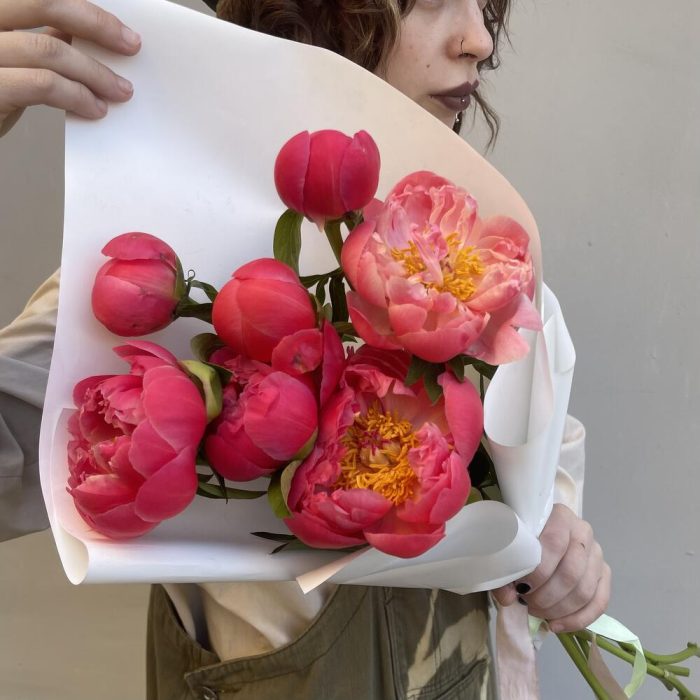 Аккуратный букет из пионов корал шарм 7 шт / 1367 id