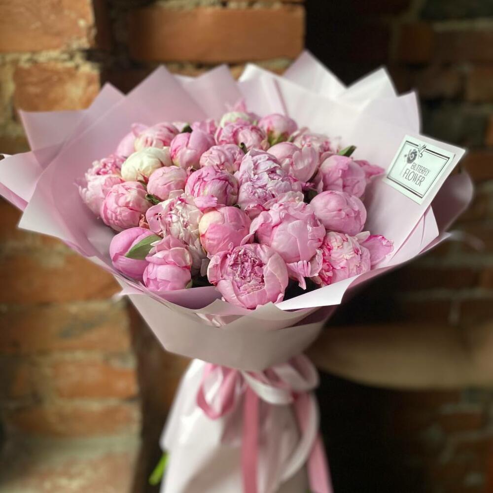 Букет из 29 розовых пионов в дизайнерской упаковке “Рэн Ортанс”