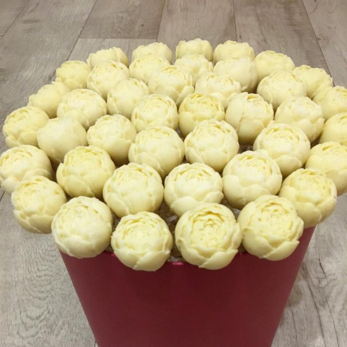 пионы из бельгийского белого шоколада – 41 шт.Шпажки – 41 шт.Упаковка – 1 шт.Атласная лента – 1 шт.Шляпная коробка – 1 шт.