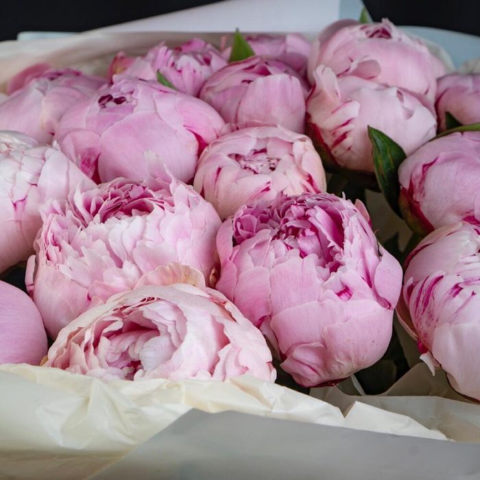 Пион розовый – 25 шт.Упаковка дизайнерская – 2 шт.Лента атласная – 2 шт.Открыточка с вашими пожеланиями – 1 шт.хорошее настроение – 100 шт.инструкция по уходу за цветами – 1 шт.коробка переноска – 1 шт.Кризал – 1 шт.