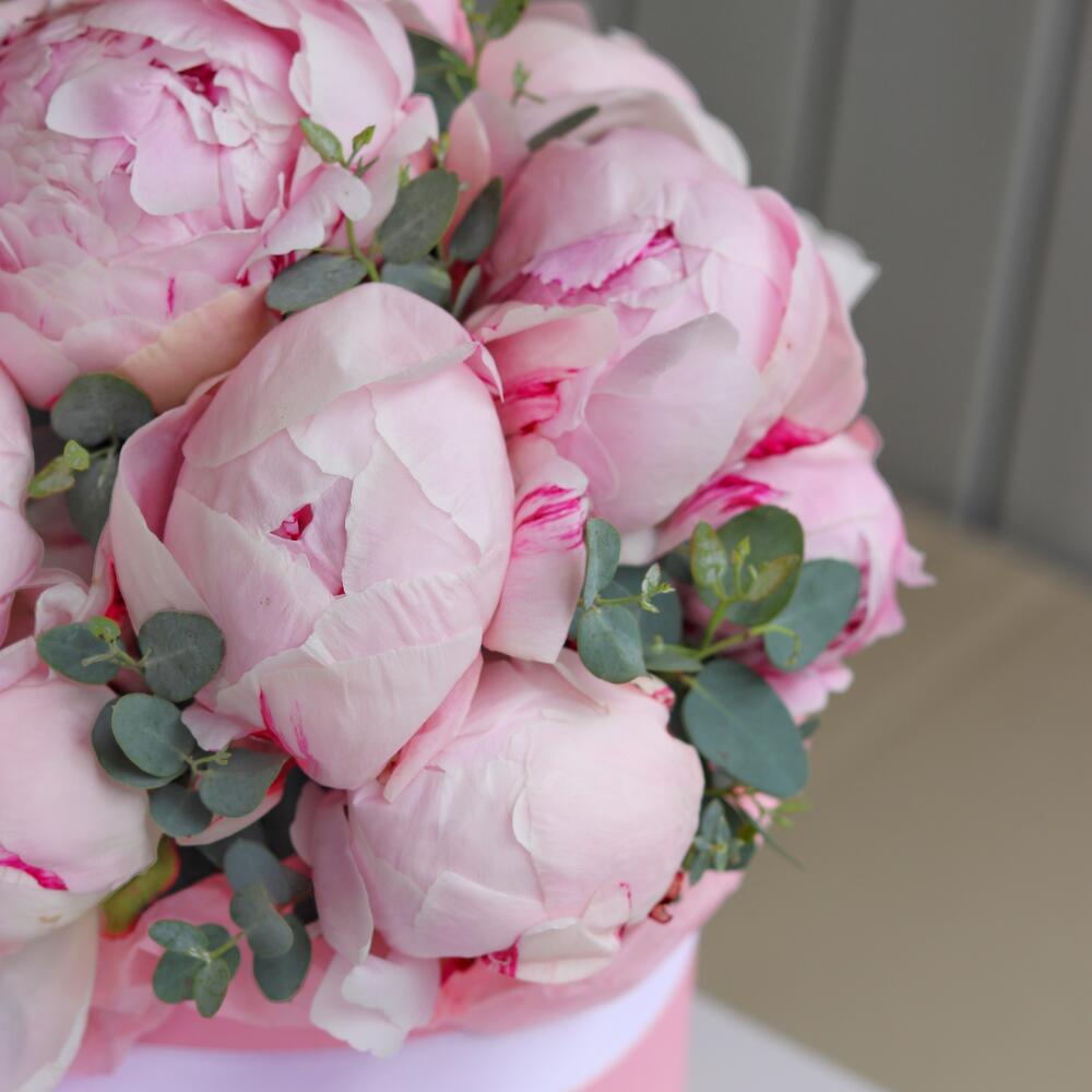 Цветы в коробке: нежные пионы с эвкалиптом