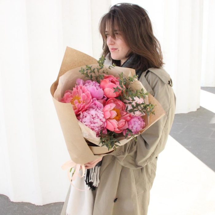 Лента – 1 шт.Пион – 7 шт.Эвкалипт – 3 шт.Тишью – 1 шт.Упаковка крафт – 2 шт.