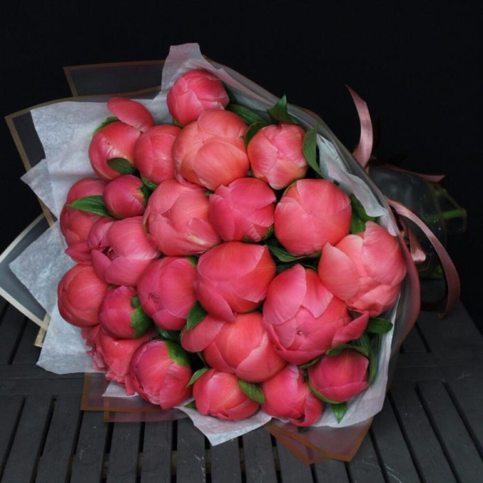 Лента атласная – 2 шт.Пленка матовая – 3 шт.Тишью белое – 3 шт.пион coral charm – 23 шт.