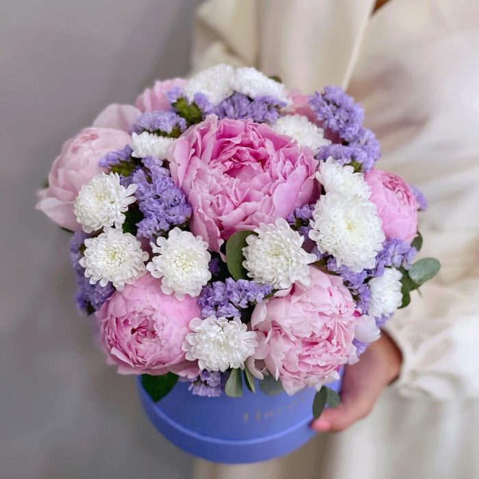 Нежная шляпная коробка с розовыми ароматными пионами и лавандовой статицей.Такой букет непременно произведет впечатление на любую девушку.Композиции в шляпных коробках не требуют перестановки в вазу, все цветы находятся в специальной флористической губке. Необходимо … Показать ещёежедневно аккуратно подливать в центр композиции воду