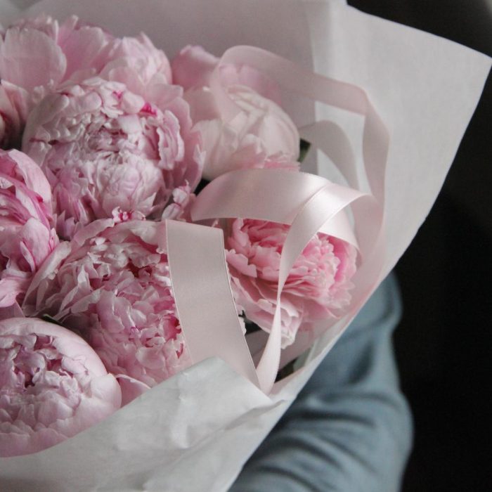 Нежный розовый букет из 15 пионов в лаконичной упаковке.Стильное цветочное решение для любого случая.Ширина букета около 40 сантиметров, высота пионов около 60 сантиметров.