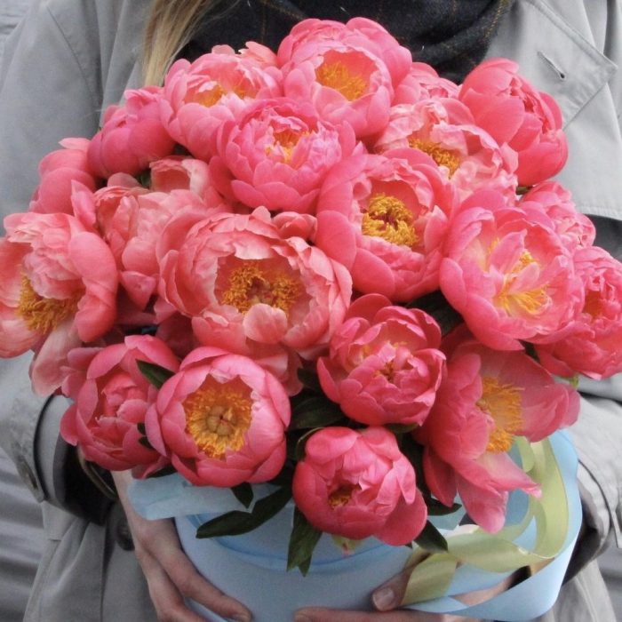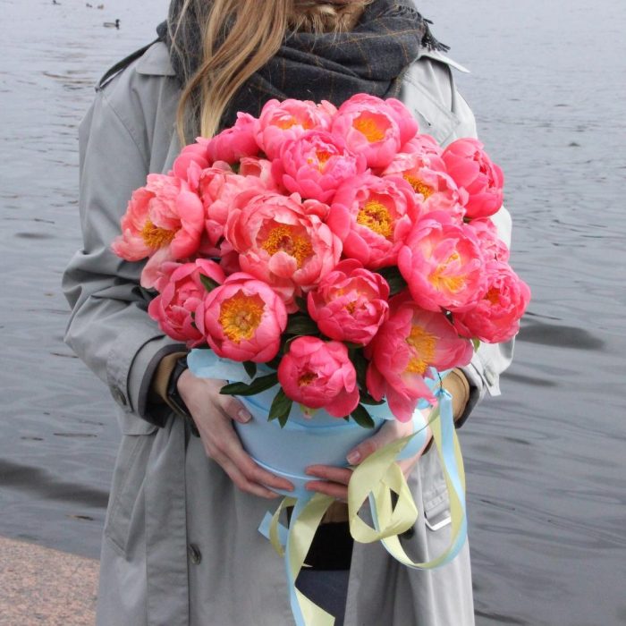 Шляпная коробка с несравненными коралловыми пионами.Стильное цветочное решение для любого случая.