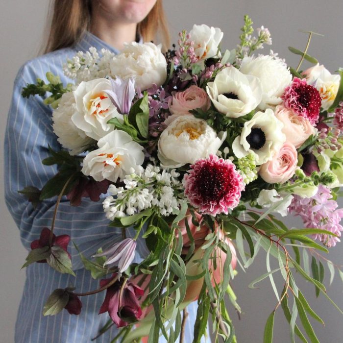 Анемон – 3 шт.Нарцисс – 3 шт.Пион – 3 шт.Сирень – 4 шт.Скабиоза – 3 шт.Эвкалипт – 5 шт.Лента атласная – 1 шт.Фисташка – 3 шт.Ранункулюс – 3 шт.Клематис – 2 шт.Львиный зев – 2 шт.Хелеборус – 2 шт.