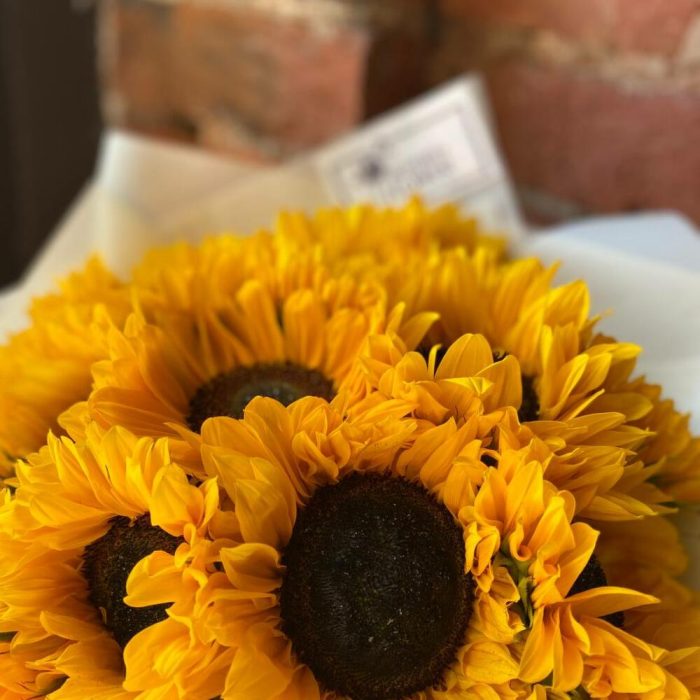 Букет из 19 подсолнухов в стильной упаковке “Солнечное сияние”