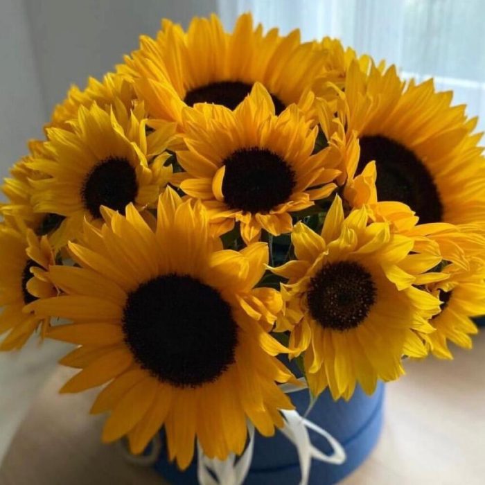 Подсолнух – 13 шт.Коробка шляпная – 1 шт.Лента атласная – 2 шт.Открыточка с вашими пожеланиями – 1 шт.хорошее настроение – 100 шт.инструкция по уходу за цветами – 1 шт.Кризал – 1 шт.