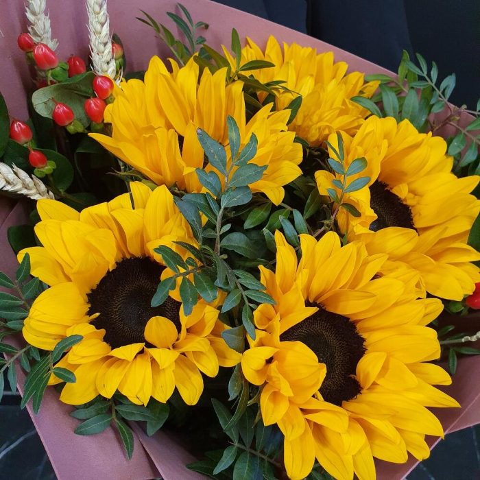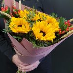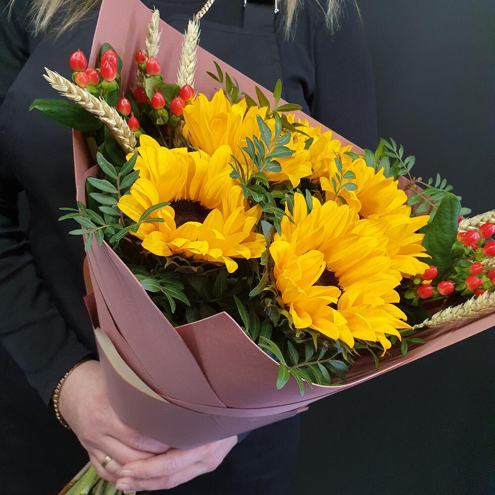 АНАСТАСИЯ солнечный букет из подсолнухов и ромашек