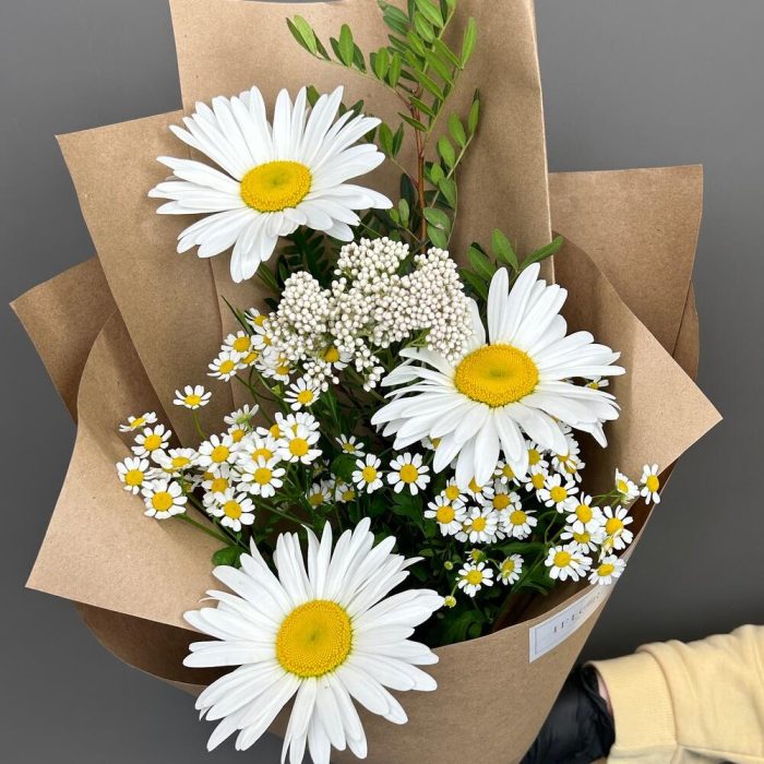 ромашки – 3 шт.Танацетум – 2 шт.Озотамнус – 1 шт.листья фисташки – 1 шт.Дизайнерская упаковка – 2 шт.