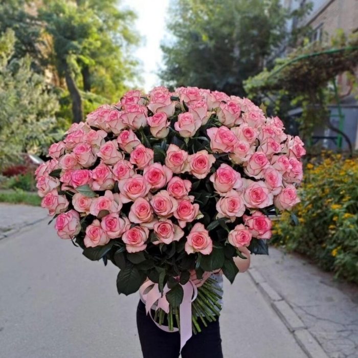Роскошный букет из 101 нежной бело-розовой розы сорта Джумилия будет прекрасным поводом напомнить о себе и рассказать о своих чувствах на языке любви.