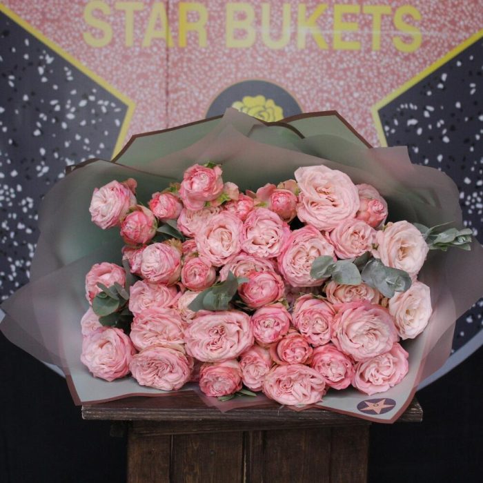 Эвкалипт – 2 шт.Лента атласная – 1 шт.Роза кустовая пионовидная мадам бомбастик – 11 шт.Пленка дизайнерская – 3 шт.