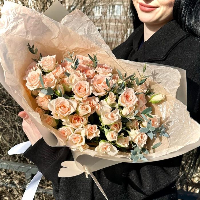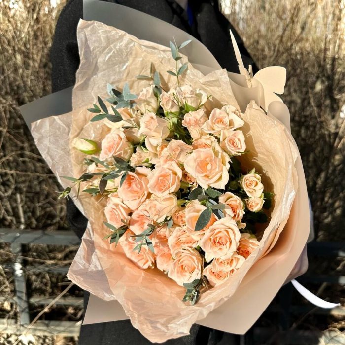 11 персиковых кустовых роз с эвкалиптом