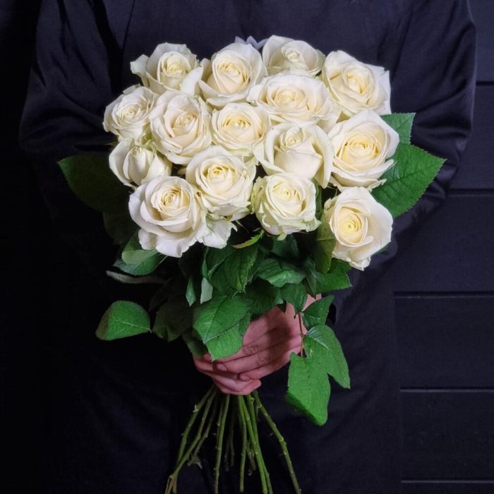 Лента атласная – 1 шт.Роза 50 см – 15 шт.Пленка прозрачная – 1 шт.
