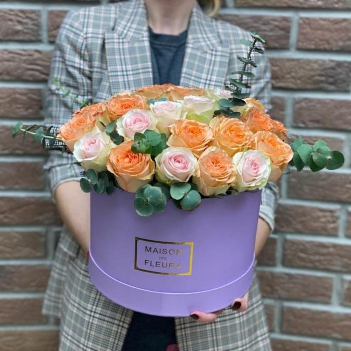 Роза одноголовая – 25 шт.Коробка шляпная – 1 шт.Эвкалипт Микс – 3 шт.Оазис флористический – 2 шт.