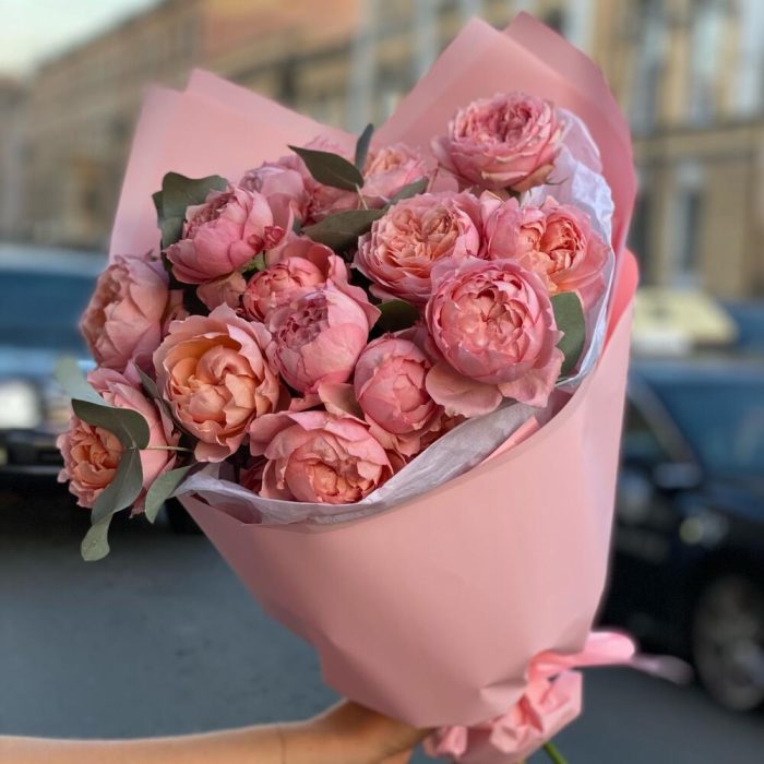 Упаковка дизайнерская – 1 шт.роза кустовая сорта джульетта – 5 шт.эвкалипт пучок микс – 1 шт.