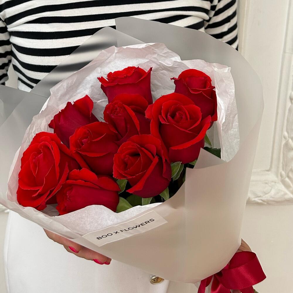 Роза Эквадор – 9 шт.Атласная лента – 1 шт.Дизайнерская упаковка – 1 шт.
