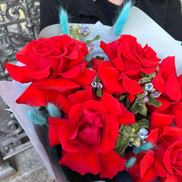 Лента атласная – 2 шт.Лагурус – 8 шт.Упаковка корейская пленка – 1 шт.твидия голубая – 4 шт.роза французская нина – 5 шт.тишью небесное – 1 шт.