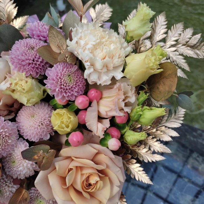 Гвоздика – 3 шт.Роза – 1 шт.Эвкалипт – 1 шт.Хризантема кустовая – 3 шт.Папоротник – 2 шт.Лента – 2 шт.коробка кашпо – 1 шт.