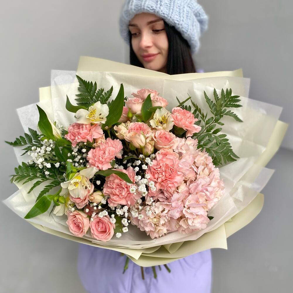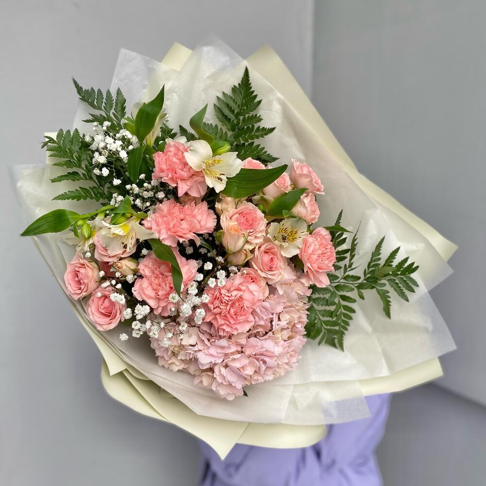 Альстромерия – 2 шт.Гипсофила – 2 шт.Гортензия – 1 шт.Папоротник – 4 шт.Роза кустовая – 3 шт.Лента атласная – 2 шт.Тишью – 2 шт.Диантус – 5 шт.Упаковка дизайнерская – 5 шт.