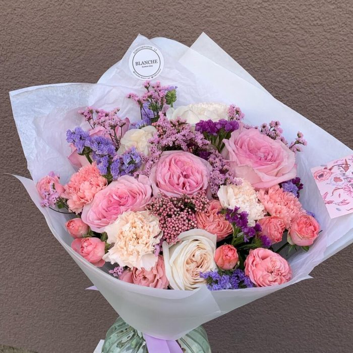 Pink O’Hara роза – 4 шт.white o’hara – 3 шт.кустовая роза madam bombastic – 2 шт.диантусы сортовые – 5 шт.Озотамнус розовый – 2 шт.Лимониум – 9 шт.Фирменная упаковка – 1 шт.
