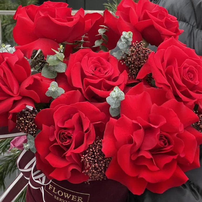 Бархатная коробка с красными французкими розами, эвкалиптом и скиммией!