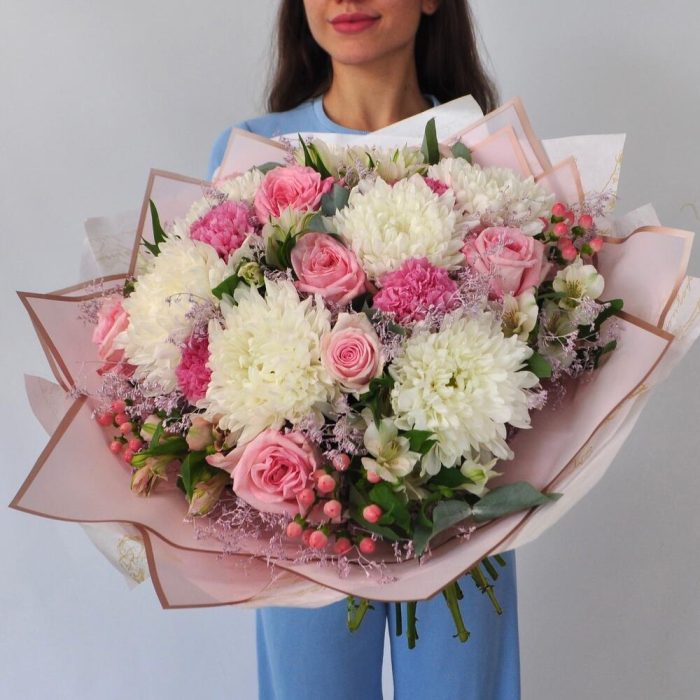 Категорий: Альстромерии, Гвоздики, Пионовидные розы, Розы, Хризантемы
