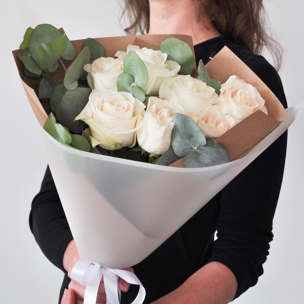 Белые розы и Эвкалипт ( 7 штук )