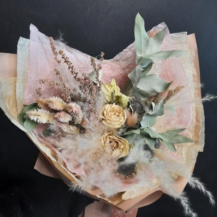 Целозия – 3 шт.Эвкалипт – 3 шт.Роза – 3 шт.Подсолнух – 4 шт.Лагурус – 7 шт.Дизайнерская упаковка – 1 шт.кортадерия – 1 шт.