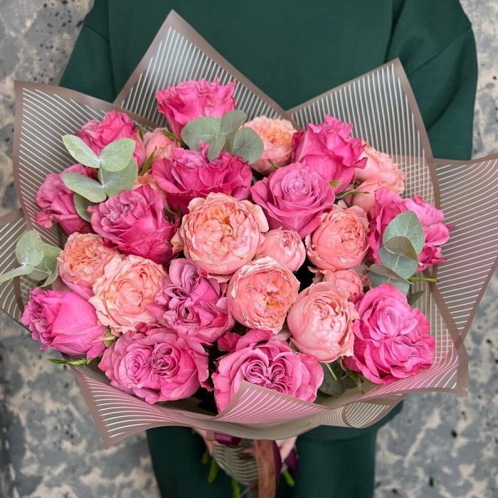 роза пионовидная кантри блю – 13 шт.роза пионовидная кустовая джульетта – 5 шт.Эвкалипт – 3 шт.Пленка матовая – 3 шт.Лента атласная – 2 шт.