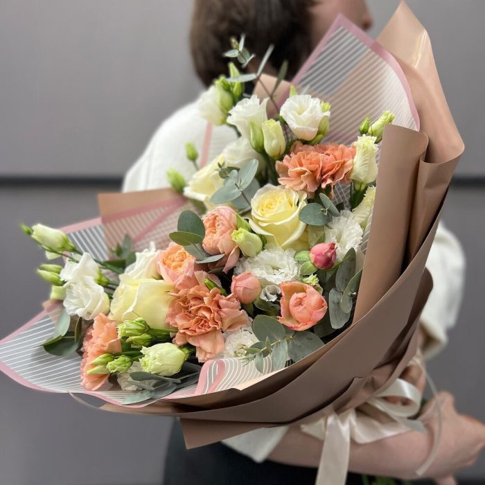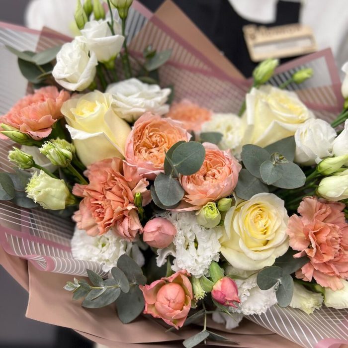 Эвкалипт – 3 шт.Лента атласная – 2 шт.Диантус – 3 шт.Роза пионовидная Джульетта – 1 шт.Пленка матовая – 5 шт.Эустома белая махровая – 2 шт.эустома розита вайт – 2 шт.роза пионовидная кэндллайт – 3 шт.