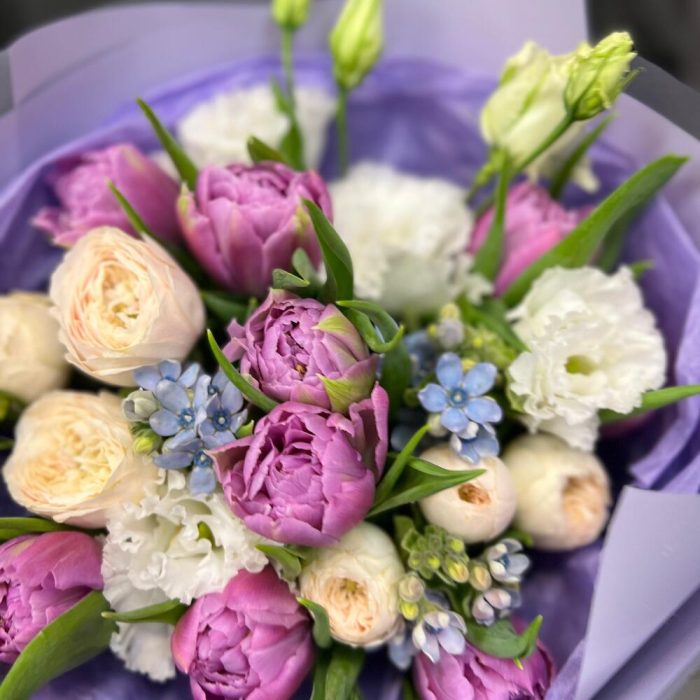 Лента атласная – 2 шт.Тишью – 2 шт.Роза кустовая пионовидная – 2 шт.Тюльпан пионовидный – 9 шт.Оксипеталум – 3 шт.Пленка матовая – 5 шт.Эустома белая махровая – 1 шт.